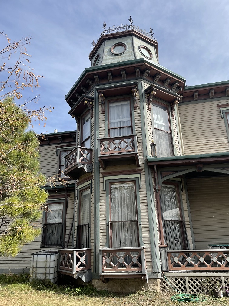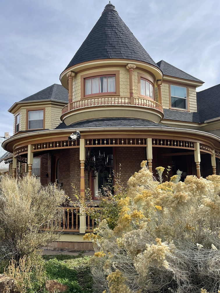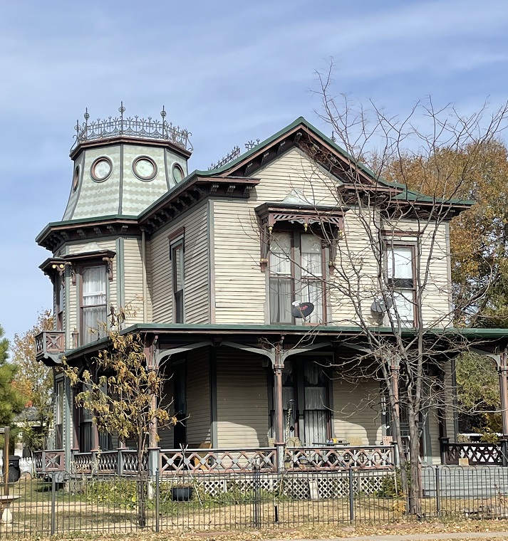 Don’t be fooled by the satellite dish and late-model Subaru Outback: this house at 512 Columbia St., just north of the library, in Las Vegas was built in 1882. According to a sign near the library, this is an example of a Picturesque Italianate Cottage. I’m inclined to agree.Perhaps it was because it was Oct. 31, but this magnificent house at 524 Columbia St., a few doors down from the Picturesque Italianate Cottage, looked especially creepy. It was built in 1881 by Charles W. Wiley, a railroad grading contractor who went on to become the mayor of East Las Vegas (as opposed to West Las Vegas, which was a separate municipality at the time). Wiley is also credited with bringing electric street lighting to the town.The building is now a bed and breakfast. It looks like a lot of work to maintain, but it’s really beautiful anyway.Many of the houses near the library had large, or even wraparound, porches. This house at 519 Washington St. has a very appealing front porch along with some other very interesting architectural features (in addition to a glorious specimen of rabbitbrush). It was built in 1898 and is 3,200 square feet.