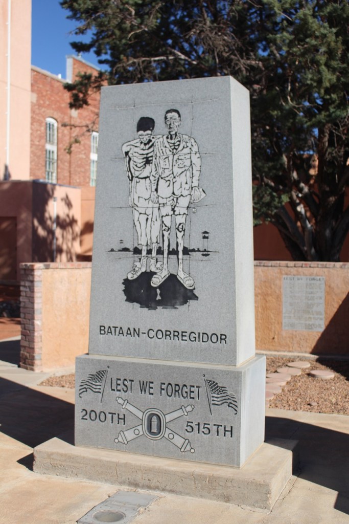 Fitting its name, Veterans Park has several memorials to soldiers who served in World War II and other conflicts. Following the surrender of U.S. forces after the three-month-long Battle of Bataan in April 1942, between 60,000 and 80,000 U.S. and Filipino prisoners of war were transferred over land to camps. Many of the prisoners marched until they died; estimates of the deaths range from 5,000 to 18,000 Filipinos and 500 to 800 Americans. An outsized number of the troops involved with the operations in Bataan were from the 200th/515th Coast Artillery Anti-Aircraft Regiments comprised mainly of New Mexican men. In fact, many of the soldiers initially signed up for service in World War II just a few steps away from the location of this monument, in the former National Guard armory that now serves as the Deming museum.