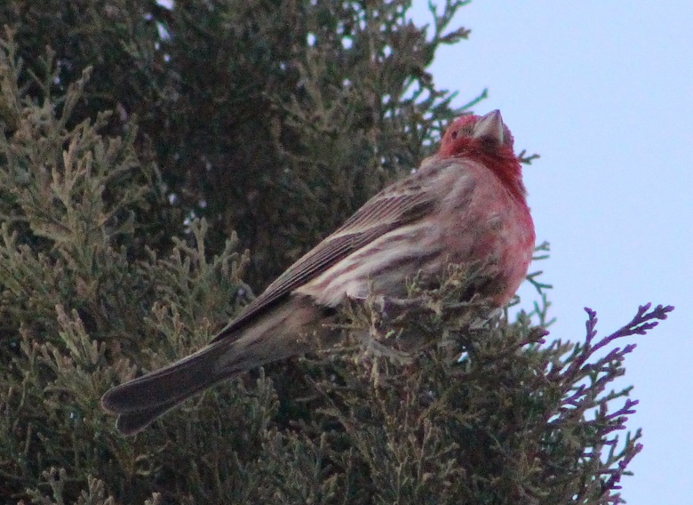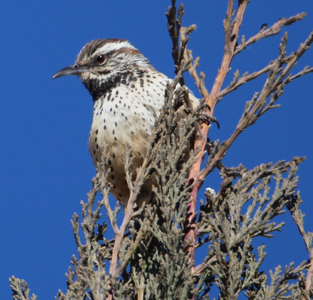 I took this photo of a house sparrow (a very common bird around the entire country) from a window inside The Goddard. It was perched in the pencil pine planted next to our front door (the one at far left in the photo of The Goddard above).Here’s another common bird, a house finch, perched in the same tree. This photo was taken in the late evening from below the bird. A bonus Did You Know / Did You Care!: house finches are native to the American southwest but some were captured in the 1940s and taken to the East Coast for breeding and to sell as house pets. That practice violated a couple of federal laws, and, in an effort to avoid prosecution, the captors released the birds to the wild. The house finches established wild populations, and now the species is found from coast to coast. The species was also taken to Hawaii in the 1870s and is now found on all of that state’s islands.Here’s a bird not found from sea to shining sea (and Hawaii): the cactus wren. This guy perched at the very top of a different campsite’s pencil pine and called out almost every morning we were in Willcox. I thought it sounded like a car with a dead battery trying to start (but in a way that’s somewhat more pleasing than what it sounds). The calls last up to four seconds and can be heard a thousand feet away.