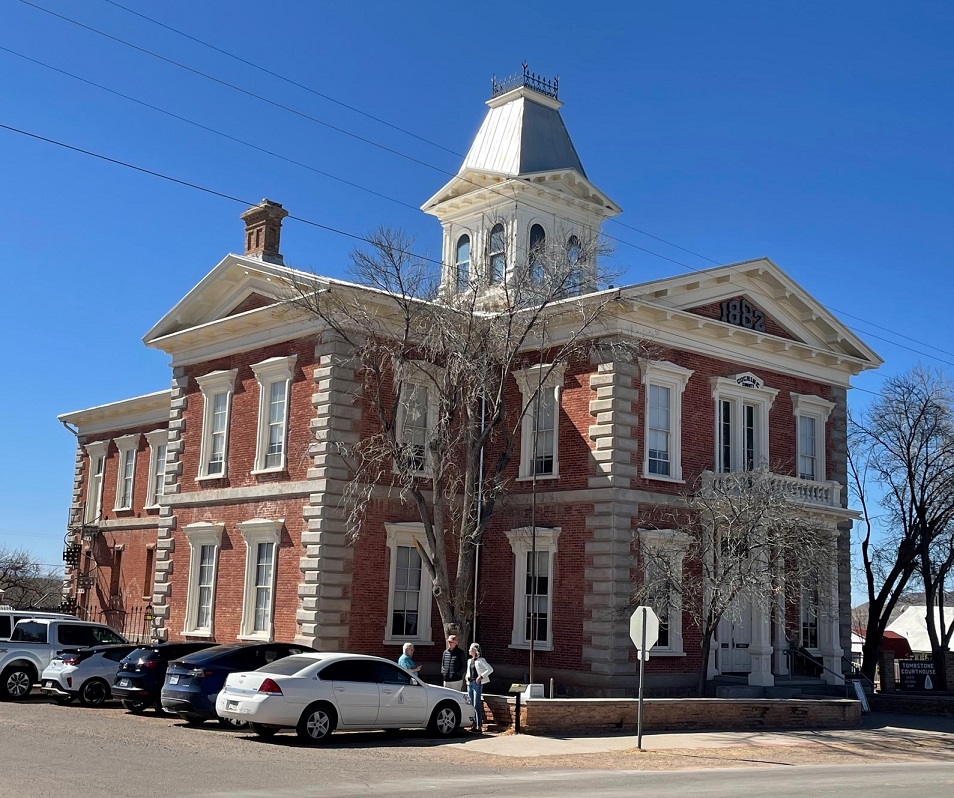 At the height of the silver boom, Tombstone had a population of about 10,000 people. It was a very wealthy city, and could offer world-class entertainment and foods that were impossible to find elsewhere in the West. By 1881, there were four churches, three newspapers (including the gloriously named “Tombstone Epitaph”), two banks, and 110 saloons. After the mining claims played out, Tombstone’s population dwindled to the point that it nearly became a ghost town. Only the fact that it remained the seat of Cochise County saved it from disappearing completely. In 1929, the citizens of Cochise County voted to move the county seat to Bisbee, about 20 miles south of Tombstone.