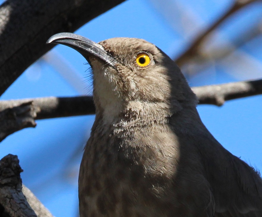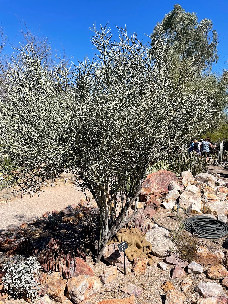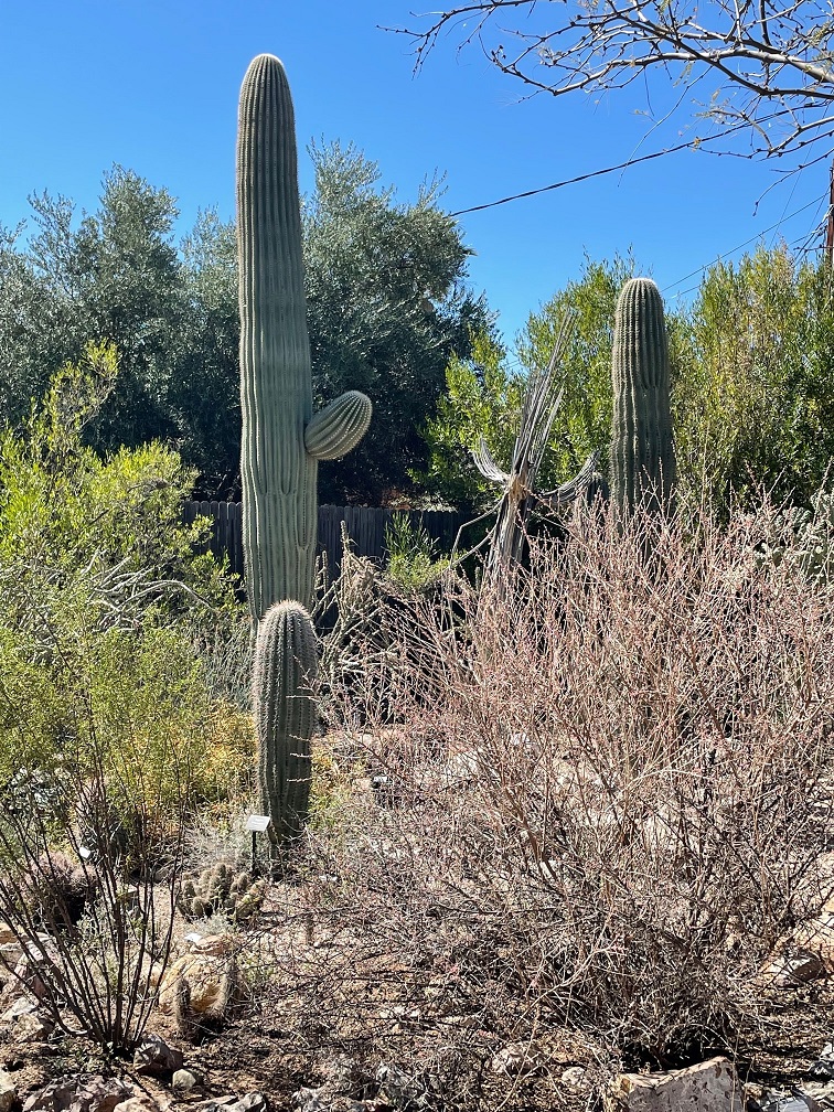 This is a very common bird, the house finch, but I like the way he’s looking at me.This grizzled specimen of cactus is a representative of Old Man of the Mountain (Oreocereus trollii), which originates in Argentina. This slow-growing cactus can reach about 3 feet in height.This is a curve-billed thrasher. It has a remarkable beak. This species is more widespread in New Mexico, but its range also includes southern Arizona and even the very southeast corner of Colorado, as well as western Texas and most of Mexico.This is a species of agave called whale’s tongue. It can grow up to 4 feet tall and 4-6 feet wide (this is a younger specimen). Mature whale’s tongues (about 10 years old) will send up a flowering stem that reaches up to 14 feet. Like most agaves, the original plant dies after flowering and distributing its seeds.This small species, Tephrocactus cactaceae, has spines that seem somewhat out of proportion to its body. It is a native of Argentina.Back to a taller species: this is thick-stemmed totem pole cactus. It grows 10 to 12 feet tall, with smooth skin and no visible spines. It is a native of Sonora and the Baja Peninsula of Mexico.Here’s the back of a broad-billed hummingbird. I took six or seven photos of this guy, and this is the best of the lot. Hummingbirds just don’t stay still very long. Other new-to-me birds that I saw at the garden were the orange-crowned warbler, the lesser goldfinch, and the verdin. I wish I had better photos to share of those last three, especially the verdin.Here’s another succulent, crucifixion thorns. Native to Madagascar, this shrub can grow up to 7 feet tall.Finally, here are several specimens of the distinctive saguaro cactus. Saguaros, native to Arizona’s Sonoran Desert, the Mexican state of Sonora, and a couple of areas of California, can grow up to 40 feet tall. We’d see a few more examples of this species when we visited Saguaro National Park a few days after our visit to the Tucson Botanical Gardens.