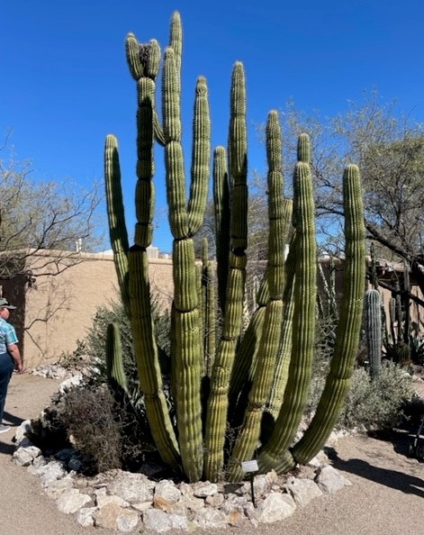 A wandering passerby (it’s Nancy) provides a sense of scale for this cactus that also grows plenty tall. This is called organ pipe cactus, and can grow 20 feet tall with a width of 12 to 15 feet. It is native to Mexico and the United States.