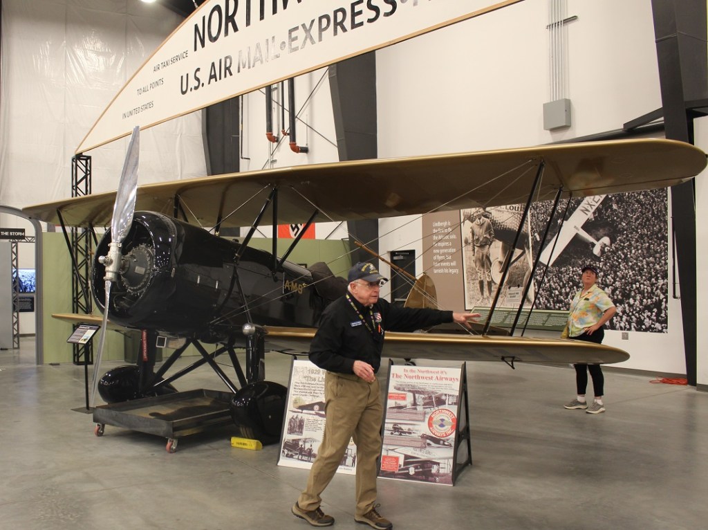 That’s our guide for the tour, docent John Lynch, in front of a 1929 Waco JYM airplane. This particular aircraft is known as “The Lindbergh Plane” because Charles Lindbergh, who in May 1927 became the first person to fly solo across the Atlantic Ocean, later flew this airplane to help promote the new industry of airmail service (which had employed Lindbergh before his historic flight). The airplane pictured provided airmail and air taxi service on the nearly 900-mile-long route between Chicago and Minneapolis.