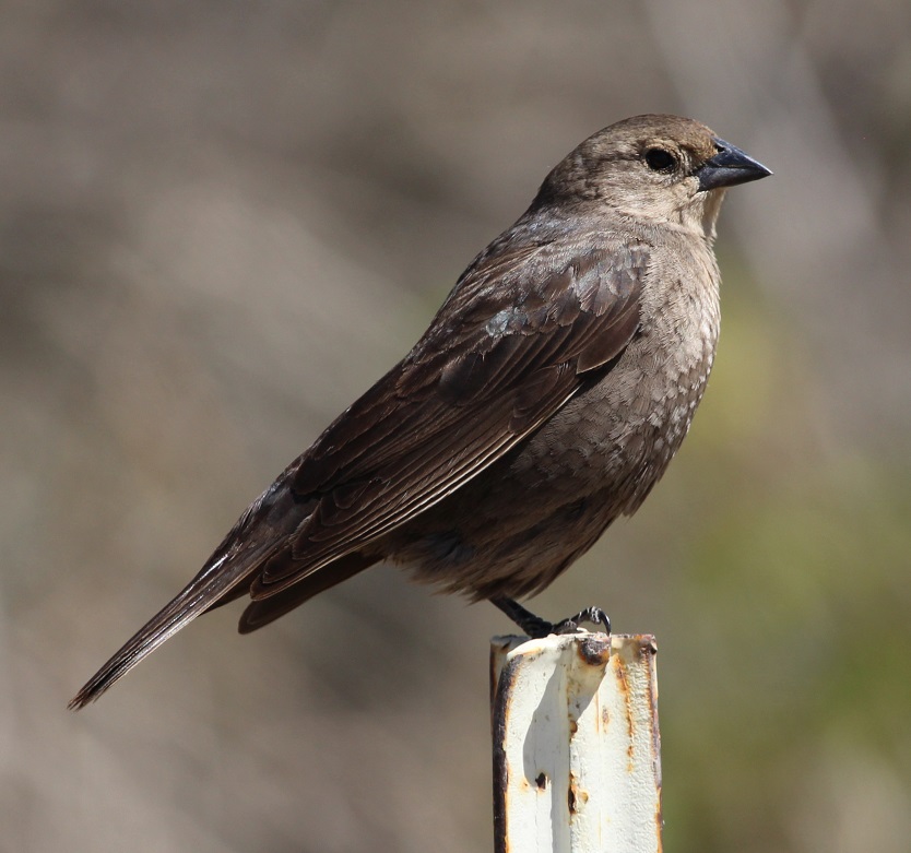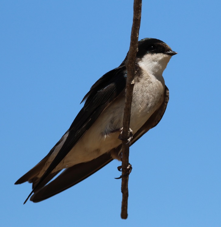 I took this photo of a female brown-headed cowbird a few minutes’ walk down the trail from the swallows’ nest. Cowbirds used to follow bison herds in the American West and forage on insects that were kicked up by the animals’ hooves. These days, they do the same with cattle herds and they’re found from coast to coast. This species has a fairly poor reputation among bird enthusiasts: it doesn’t build a nest in which to lay its eggs but instead lays its eggs in the nests of other bird species. This parasitism, which is practiced by only a few other birds, results in reduced numbers of other songbird species.