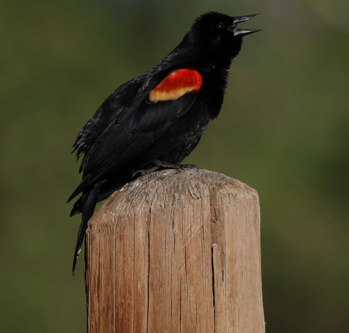 Whenever I think of St. Vrain State Park, the first bird that comes to mind is the red-winged blackbird. Their distinctive call (you can hear it at the soundfile below) can be heard throughout the park practically all day long, but especially in the early morning hours. While I’ve seen red-winged blackbirds perch on waving reeds and cattail stalks, in addition to tree limbs, this one found a solid fencepost upon which to belt out the hits. This is a bird species in which the males and females look nothing alike. This is a male blackbird; I’ve mistaken female blackbirds for some type of sparrow because they share the same light and dark brown markings.