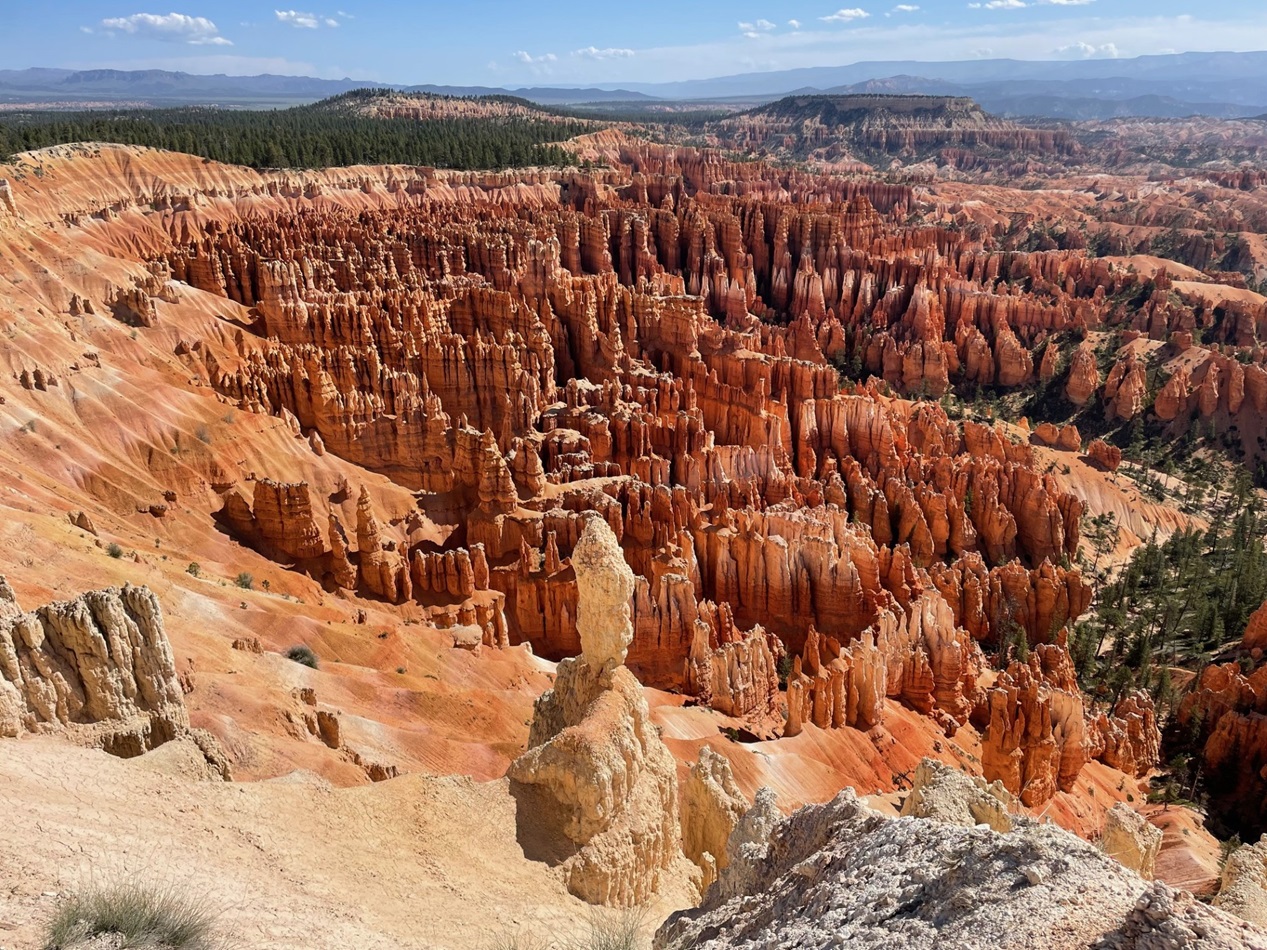 Bryce Canyon National Park is the easternmost and highest “step” in the Grand Staircase, an immense geologic structure stretching across 100 miles of southern Utah and Arizona. The Grand Staircase includes two dozen distinct layers of rocks representing 525 million years of sedimentation from ancient inland seas, lakes, swamps, and forests. Arizona’s Grand Canyon contains the oldest rock layers and forms the western and lowest edge of the Grand Staircase.