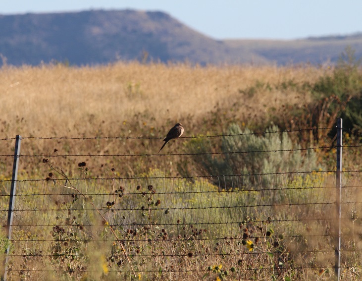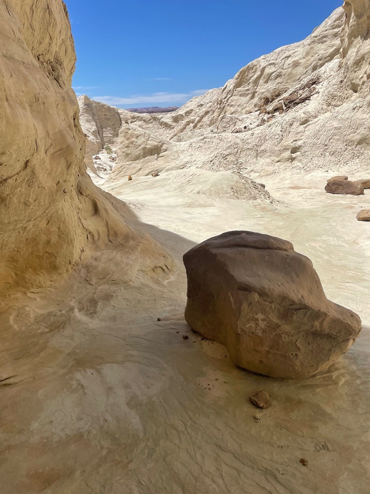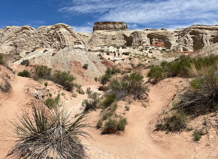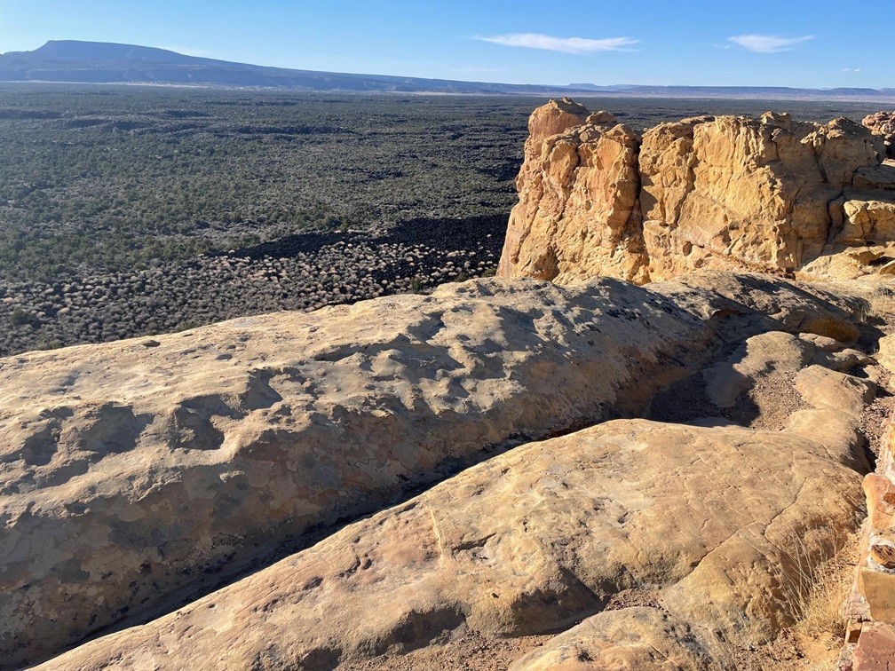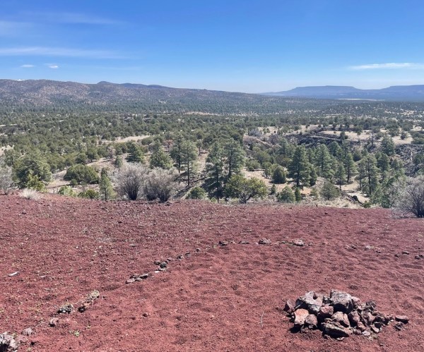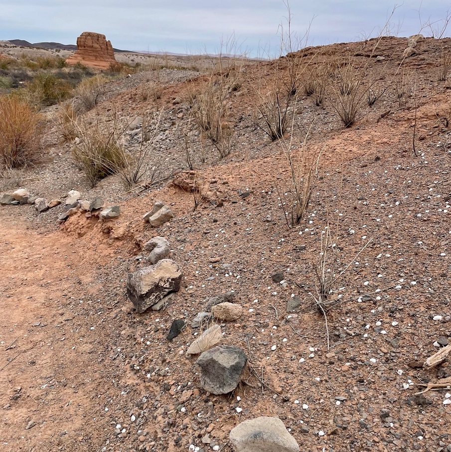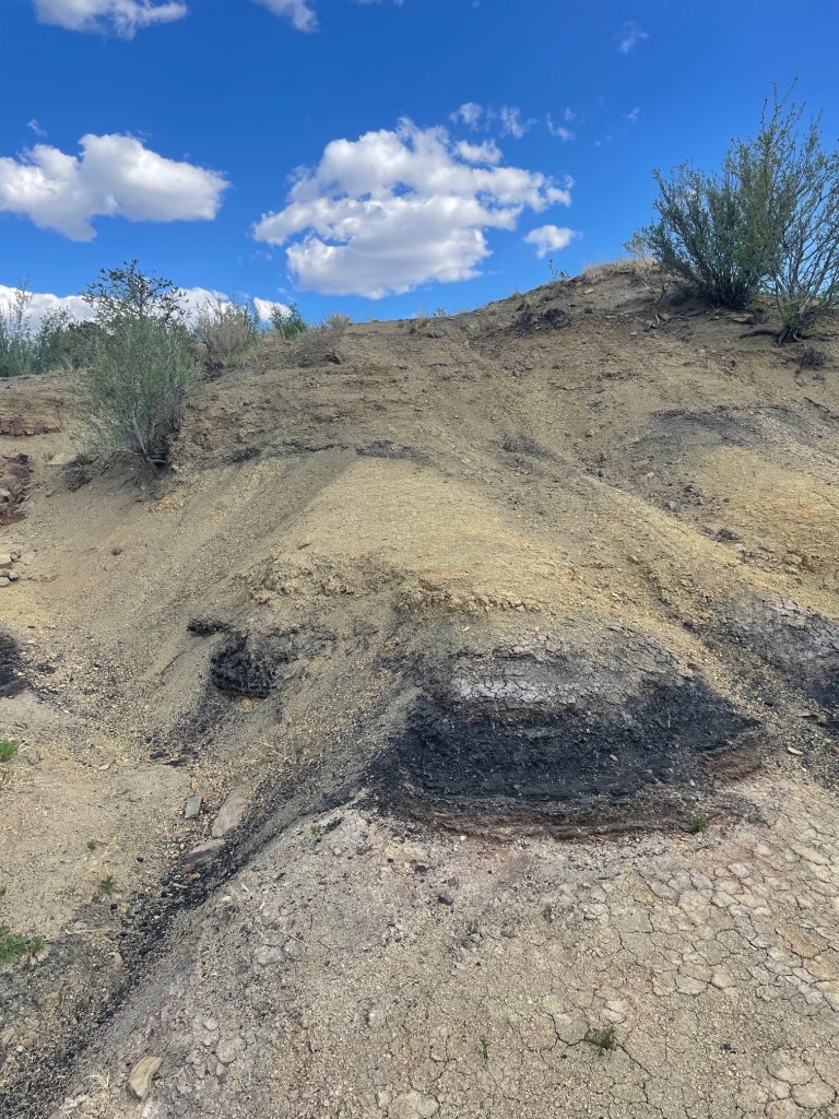 Nancy and I visited the site of the iridium layer late one afternoon in early May. I’d secured a permit to visit the site the day before at Raton’s municipal office. It turned out we didn’t really need a permit because it simply supplied the combination to a locked gate on the road and permission to park at the iridium layer site, and we didn’t think that there’d be room for the Goddard’s six-wheeled and 22-feet-long towing unit. We instead parked the towing unit downhill from the iridium layer site and hiked past the gate and then a mile or so to the site itself (the walk the day before from our campsite to the municipal office to acquire the permit, which we didn’t need, and back was 5.5 miles). Both were lovely walks (I saw a small group of mule deer in the front yard of a house in Raton on the way back to our campsite).