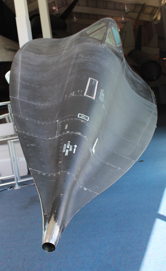 The Cosmosphere’s significant 1997 expansion gave it space to display one of the 20 surviving Lockheed SR-71 Blackbirds. The SR-71 first entered service as a high-altitude reconnaissance aircraft in 1966. The aircraft had a top speed of 2,200 mph (Mach 3.3) with a service ceiling of 85,000 feet, or about 16 miles (the scientists have determined that Earth’s atmosphere ends, and space begins, at about 62 miles above the planet). Lockheed built a total of 32 SR-71s; 12 were lost in accidents but none were destroyed by enemy aircraft (if an oncoming missile was detected, the Blackbird pilot simply went faster). The SR-71 (this particular model has Air Force serial number 61-7961) makes for a really impressive exhibit, but it’s difficult to get a photograph of the entire craft. This was the second SR-71 we’d seen in just two months, we saw AF model 61-7951 at Tucson’s Pima Air & Space Museum in March; most of the other 18 surviving Blackbirds are also on display at aircraft museums and Air Force bases around the country (one is in England)