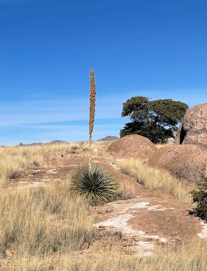They still haven’t agreed on a direction in which to hike. The park has a huge variety of succulents, like the soaptree yucca at the left of the trail, as well as many grasses common to the southwestern United States.