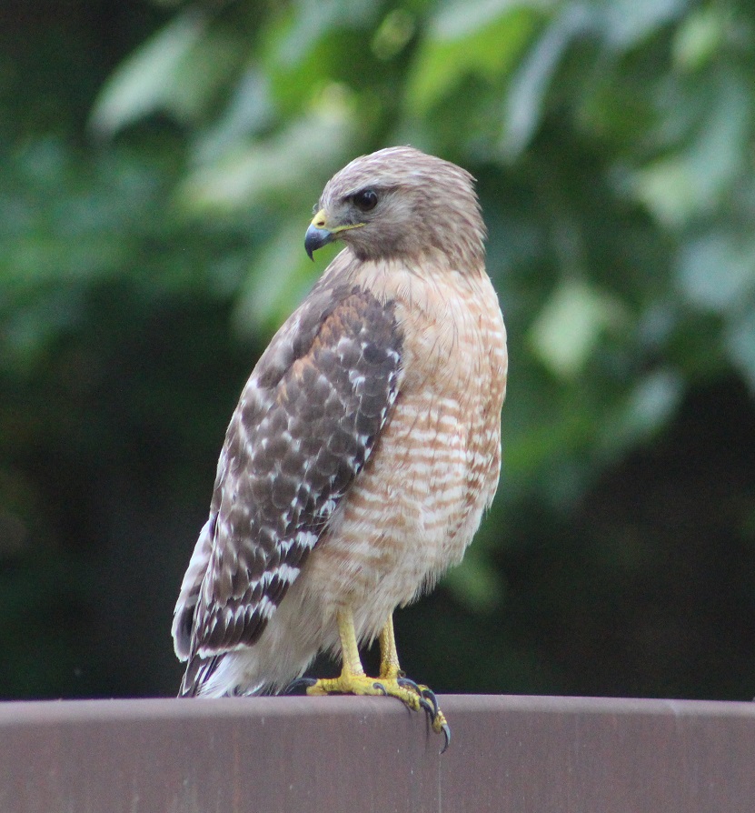 This is the same bird that I wrote about in the blog posting about our visit to the gardens at the Philbrook Museum of Art, but I wanted to post this alternate photo because this red-shouldered hawk (Buteo lineatus) gave us plenty of opportunity to admire it while it perched on a bridge railing (until some ne’er-do-well kids came tramping along and scared it off, but whatever). Although there’s a small population in coastal California, this is an eastern United States raptor; Tulsa, in eastern Oklahoma, is on the very western edge of their habitat. They’re a little smaller than the red-tailed hawks that are common in the western United States. This species prefers the cover of heavily treed areas (which describes the gardens at Philbrook Museum of Art quite well). Up until around 1900, these birds were among the most numerous raptors in the United States, but deforestation and, until it was banned, DDT contributed to a marked decline in their population.