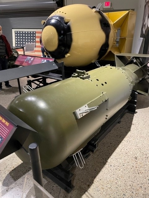 A replica of “The Gadget,” the test atomic weapon that was detonated at the Trinity site in New Mexico (now part of the White Sands Missile Range between Alamogordo and Las Cruces). It was dropped from a 100-foot tower during the operation. The test detonation, and the remarkable destruction that it caused, prompted Robert Oppenheimer, director of the Las Alamos Labratory, to reflect on the phrase “Now I am become Death, Destroyer of Worlds,” which is taken from Hindu scripture.A replica of Little Boy, in front, which was the first atomic weapon deployed in warfare, and Fat Man. Little Boy was dropped on Hiroshima on August 6, 1945, from the B-29 Superfortress Enola Gay, killing about 70,000 people (30% of Hiroshima’s population) and destroying about 75% of the city’s buildings and roads. The B-29 Bockscar deployed Fat Man over Nagasaki on August 9, 1945, killing about 35,000 people. Japan, facing an imminent invasion of the Japanese archipelago, the possibility of additional atomic bombings, and a Soviet intention to begin hostilities, announced its intention to surrender on August 15, and signed the official documents on September 2, 1945, bringing an end to World War II.