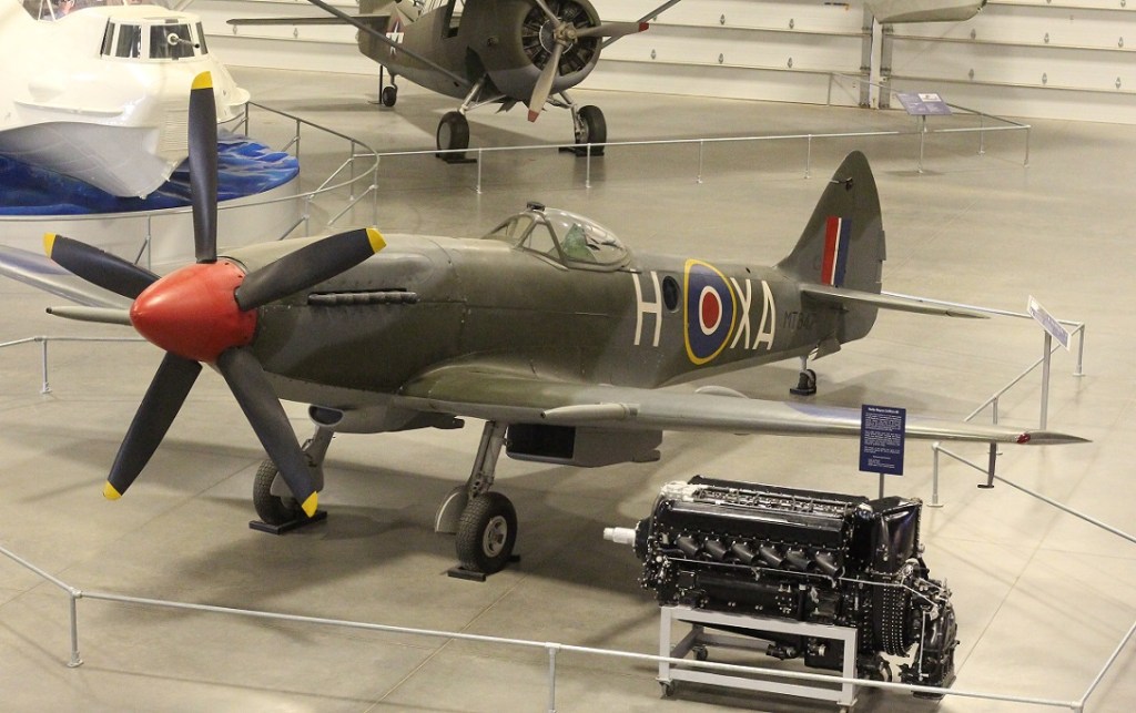 An unidentified tour participant, who seems to be in a lot of these photos, lends a sense of scale to this TBM Avenger. With a gross weight of 15,500 pounds, this was the heaviest single-engine aircraft of World War II. Grumman built the first Avengers, which originally flew just a few months before the attack on Pearl Harbor in 1941. It was formally introduced in 1942, and Grumman would go on to build almost 2,300 TBFs (torpedo bomber, and the “F” was for “Grumman,” for reason that probably makes sense from a military perspective). Electing to stop building Avengers in 1943 so that it could focus on the production of fighter aircraft, Grumman awarded a contract to General Motors to continue building the torpedo bombers. GM would call its versions TBMs (“M” for “Motors”). In all, Grumman and GM built almost 10,000 Avengers for the U.S. Navy, Marine Corps, and Allied naval and air corps. Note the folding wings, which allowed for more of these aircraft to be carried by … aircraft carriers.