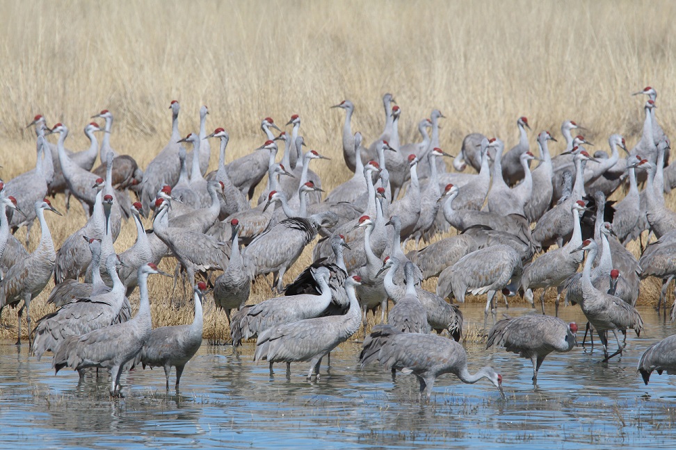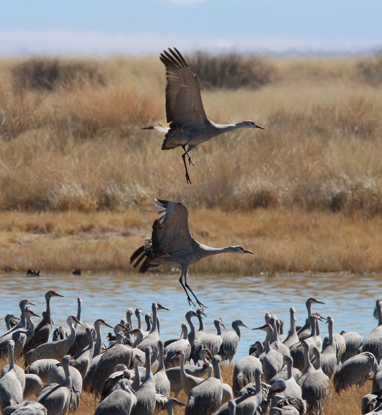 The Mid-Continent population of sandhill cranes has about half a million birds and nests in northern Canada and Siberia. This population has a major migration stopover in the Platte River Valley near Kearney, Nebraska. That town, too, has a festival each year – Nancy and I enjoyed a visit there some years ago where we were first introduced to sandhill cranes from an Audubon Society blind next to the river. We also saw and heard sandhill cranes during our stays last year in Albuquerque through Las Cruces, New Mexico.