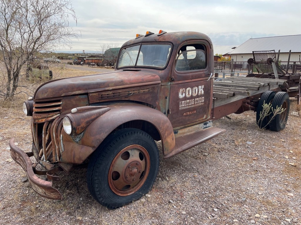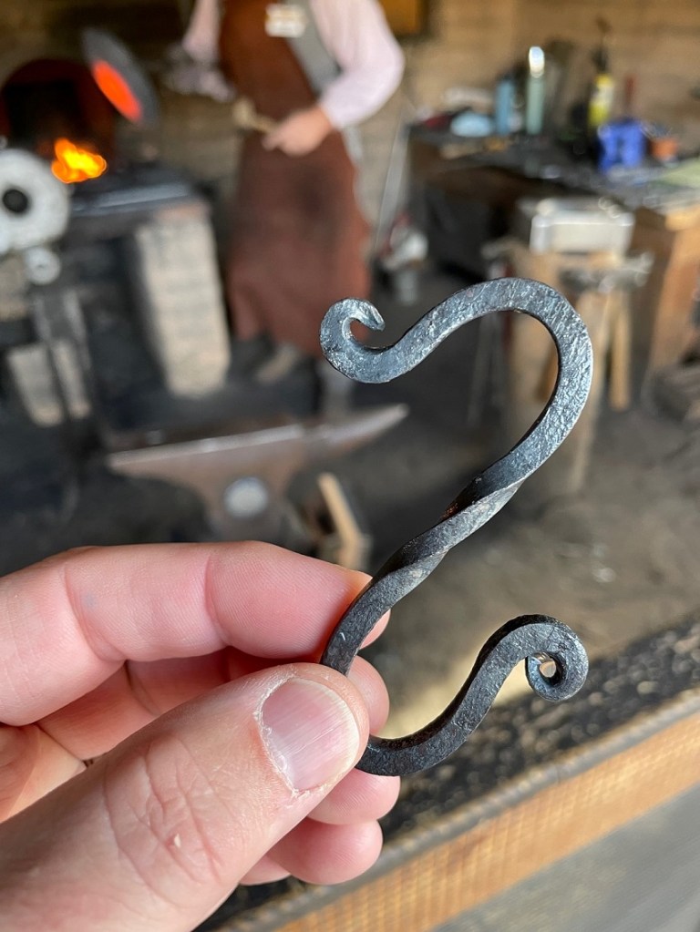 The museum’s pens had a good variety of cattle breeds: joining the Hereford from Great Britain were a couple of Angus, and they also had a Brahman bull, Texas Longhorns, and an important breed that I’d never heard of called Corriente.The Spanish brought the Corriente breed to North America from the Old World in the 1490s and the cattle arrived in the American Southwest in 1598. “Corriente,” which translates to “common” or “cheap,” was one of the foundation breeds for Texas Longhorns, which were brought north into the American West on the great cattle drives beginning in the 1830s. Today the breed is mostly used as rodeo stock.This is a Corriente calf that was just a few days old when we visited. It was laying right next to its mother (not the white Corriente cow pictured above). The museum also has several horses, in addition to sheep and goats.The museum has a huge collection of vehicles, including tractors and trucks, that saw work on New Mexican farms and ranches in the past decades. This is a 1946 1 1/2-ton Chevrolet pickup. It’s an example of Chevrolet’s product line from 1941-1947 that has been called “art deco” by enthusiasts because of the design of the grille and hood.This is a small grove of pistachio trees at the museum. Pistachios are grown in New Mexico, Arizona, and California; the latter state has 99% of the production, but pistachios are very popular as a snack in New Mexico. There are now more than 25,000 farms in New Mexico, producing a value of $3.4 billion in value (30% crops, 70% livestock) each year and making agriculture the #3 industry in the state. New Mexico produced 63,000 tons of chile peppers in 2019, making it the nation’s number-one state for that invaluable resource. Guess which state ranks #5 in onion production in all the land! It’s New Mexico!This is an agave plant, situated outside the museum’s greenhouse, with a flower stalk that I think is about 30 feet tall. Some of the stalks can grow to 40 feet. The stalks are produced at the end of the agave plant’s life; the stalk falls down and spreads its seeds to begin the cycle anew. Agave is used for food and fiber, and I am given to understand that it’s also used in the production of tequila and other mezcals.Of course, one of the highlights of a visit to any agricultural museum is checking out the collection of manure spreaders, and on this opportunity the New Mexico Farm & Ranch Heritage Museum does not disappoint. First developed in 1875, manure spreaders did the work of five people attempting to spread manure by hand. Early manure spreaders, like most implements, were originally pulled by horses until tractors became more available. This magnificent example was made by the J.I. Case company, which was founded in 1842 by Jerome Increase Case as the J.I. Case Threshing Machine Company. The museum has a really impressive collection of vintage equipment, including threshers, hay stackers and balers, harrows and plows, and much more.We enjoyed visiting with Jim McConnell, who was busy in the museum’s blacksmith shop. Here he’s creating the rounded side of a skillet using a rawhide mallet. The smell of the leather mallet, when it struck the red-hot metal, reminded me of being around cattle being branded – which I guess makes sense. Jim was a lot of fun to talk with. He said that blacksmiths were often the most educated people in a rural community, because they had to be knowledgeable about chemistry, physics, and all kinds of math like geometry and algebra.Here’s an “S” hook, used for hanging tools or kitchen pans and utensils, that Jim made that day; Jim is busy heating his skillet (note the color of the metal) for more shaping over the fire in the background. Blacksmiths usually have several projects going at the same time because of the need to wait for the metal to cool down to the correct temperature before continuing. Also note the fancy twist in this hook – great work, Jim!