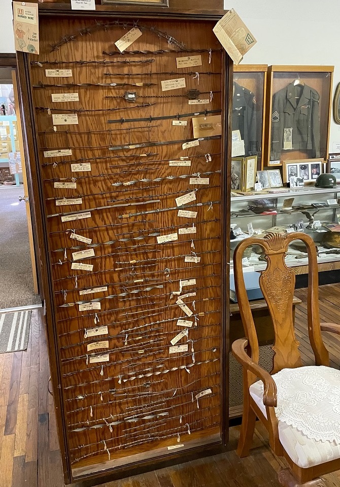 Here’s a large collection of old farm and ranch tools. Nancy noted that the person who wielded the sheep shears (to the right of the curry comb and bullet mold at center left) probably had impressive forearms. The shears date to the early 1900s.