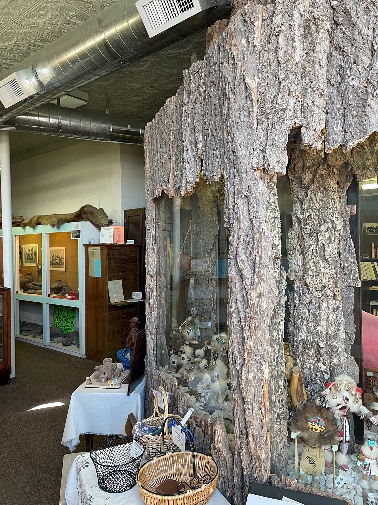 It’s hard to ignore the structure on the right: it’s pine bark that’s enclosing the museum’s office. I’m uncertain when, but some decades ago a Pima town employee used prison labor and the city’s dump truck to collect several loads of pine tree bark from the nearby Graham Mountains. They cleaned up the bark and then fumigated it under plastic to kill the insects, and then used the bark to construct display cases for the museum. In 1997 most of the display cases were remodeled like the ones on the left, but the bark remains around the museum’s office.