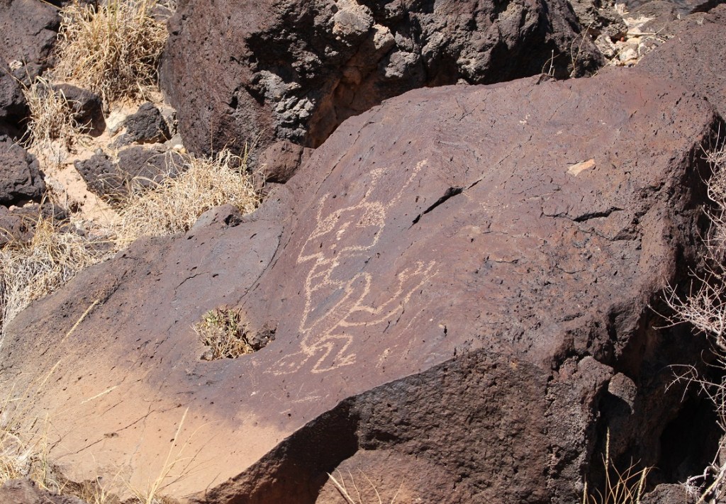 The canyon and surrounding area are covered with fairly large basaltic rocks from volcanic eruptions that occurred a couple hundred thousand years ago. The rocks contain a lot of metallic minerals such as iron and manganese, and, when exposed to water and sun over the millennia, the rocks turn nearly black. The people who lived in this region used tools to carve abstract designs as well as depictions of animals and people into the basalt. Although some of the petroglyphs in the monument are 3,000 years old, most date from between A.D. 1300 and A.D. 1700. The people who carved them didn’t live in what is now the monument; they lived closer to the Rio Grande river that flows through present-day Albuquerque, five or six miles away.