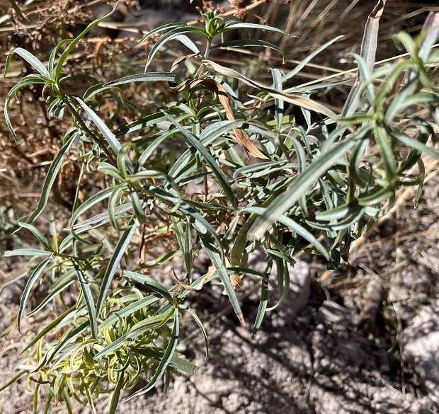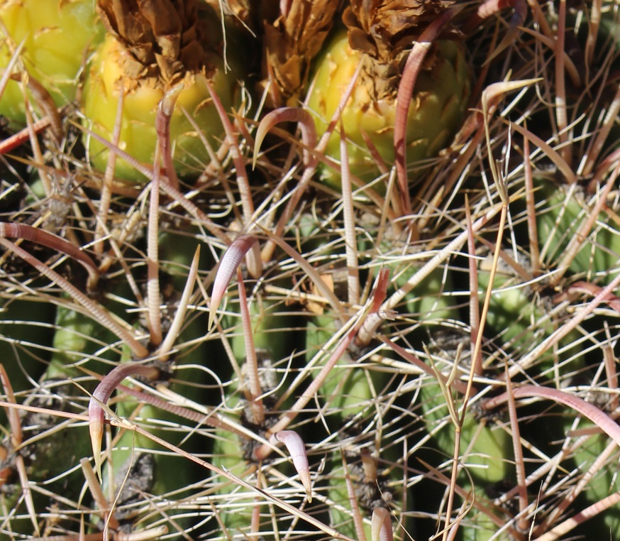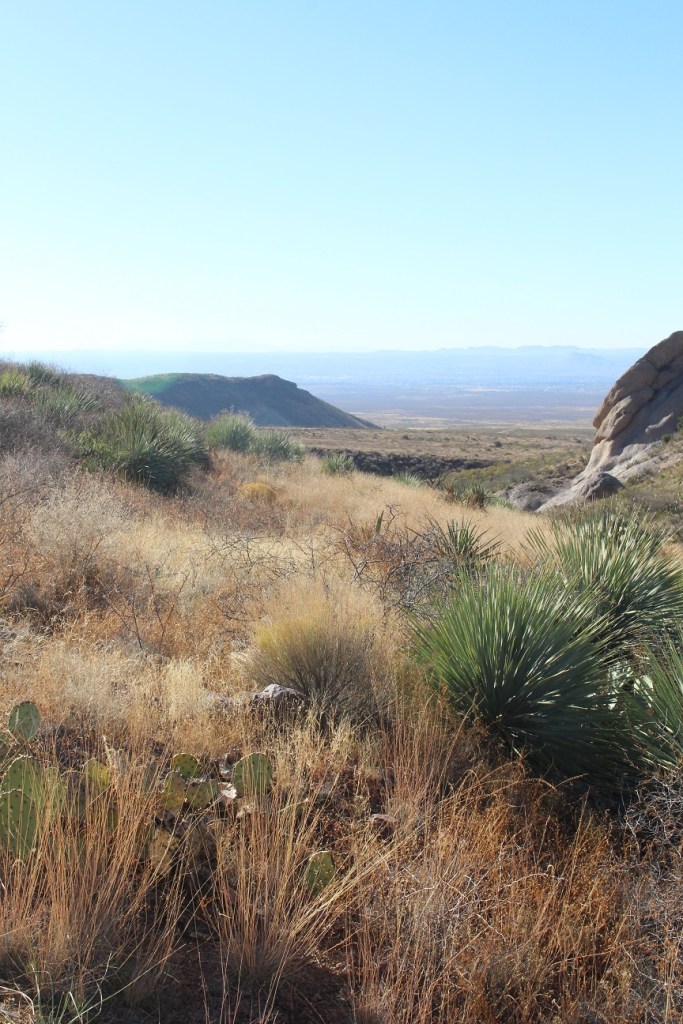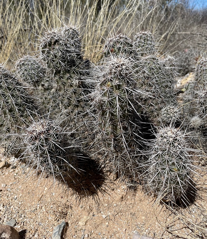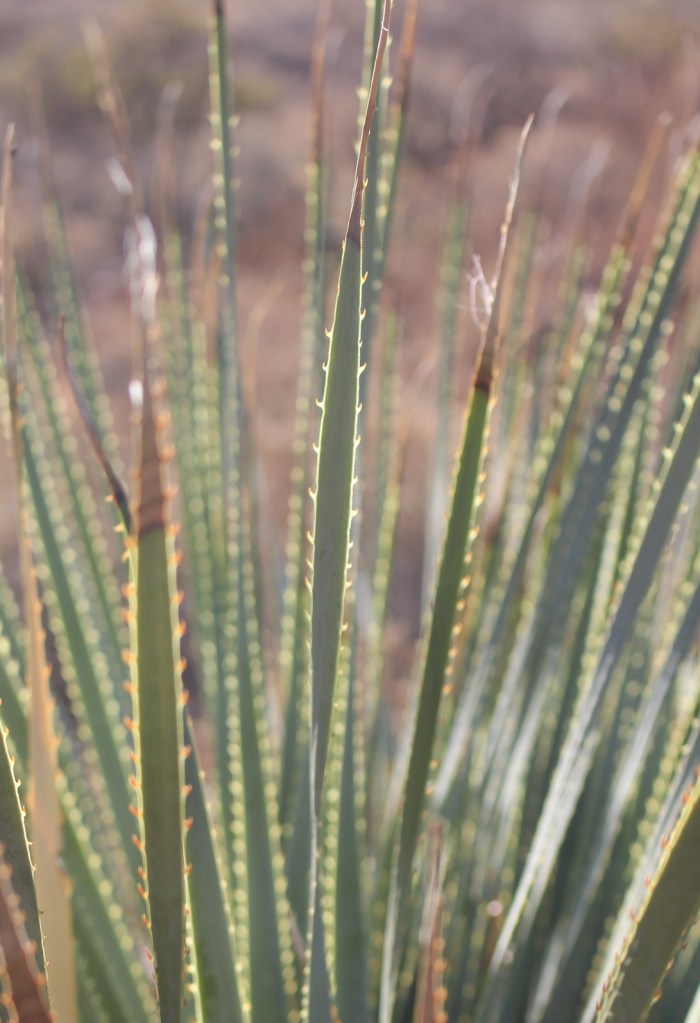 The plant in the foreground is desert spoon. Although it looks like a succulent, it’s classified as a shrub. It’s also known as sotol.The monument is located in a really harsh environment, but there’s a huge variety of plant life. Prickly pear cacti abound, of course, but there are also 15 species of grass. Prior to becoming a monument in 2014, the area was used for many years by ranchers for grazing their cattle.There were some unexpected finds of plant life. A seasonal stream runs near La Cueva, and it supports some decidedly deciduous trees (that look like they still had to work pretty hard to grow).These are the spines of a type of barrel cactus called a fishhook, and you can see how it earned that name. We have seen lots of fishhook cactus in the wild and also in cultivated gardens in New Mexico.On the trail, Nancy, always on the lookout for historic mines, recognized the mound of light-colored rocks in the lower left as a tailings pile. Just a few steps later on the trail, an interpretive sign identified the area as being what remains of the Modoc Mine. The Modoc Mining Company spent a million dollars in 1898 (more than $30 million today) to build the silver and lead mine, a three-story ore mill, and a small townsite. The mine had shafts that tunneled several hundred vertical feet, and a well drilled four hundred feet down supplied water to everything.Here’s a closeup of some desert spoon spines. As with most plant life in the Chihuahua Desert, it’s best to look and not touch. And definitely don’t lick these spoons. The Spanish word for spoon is “cuchara,” which is the name of a spoon-shaped valley in Colorado’s mountains that’s home to a former ski resort also named Cuchara.This is looking west from the monument. The city of Las Cruces is behind the dark ridge on the left. Prickly pear cactus in the left foreground; desert spoons in the right. Spoons, spoons, spoons … everywhere! … And here are some more. Desert spoons send up a flower stalk six to 17 feet tall, but their roots extend only about a foot underground.The Organ Mountains are really interesting to look at – the erosion over millions of years has resulted in some very picturesque rock formations. All of the lighter green plants in front of the mountains are prickly pear cactus.After all of the desert plants we’ve seen, it was nice to encounter this old friend growing alongside the trail. I learned about sideoats grama, and many other range grasses, as a high-school student in Vocational Agriculture class.This pretty grass is splitbeard bluestem, also known as silver bluestem. It was not one of the grasses I learned to identify in high school, so more learning for me now. In late November, of course, all of the grasses had already gone to seed but a few retained their seedheads.This is black grama, which looks very similar to blue grama that grows in Colorado. Because of its quantity and nutritive value, black grama is a very important natural grass for New Mexico’s cattle ranchers. Blue grama is my favorite species of grass (a close second is big bluestem, a relative of the splitbeard bluesteam above), probably because the mature seed heads look like eyelashes. What’s your favorite species of grass, and why is it also blue grama?