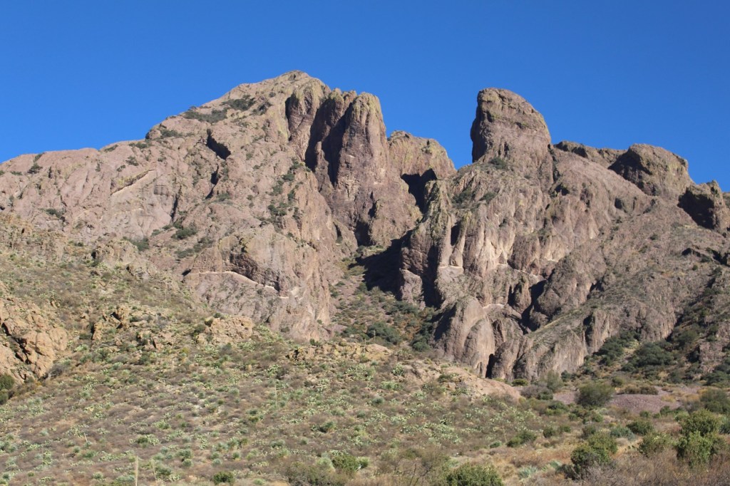 This is a mountain called Cochise Head, from a viewpoint looking northeast from Massai Point. It’s said to resemble the rugged face of a Chiricahua lying on his back. Fort Bowie National Historic Site, which we visited the previous weekend, is just on the other side of this rock profile.