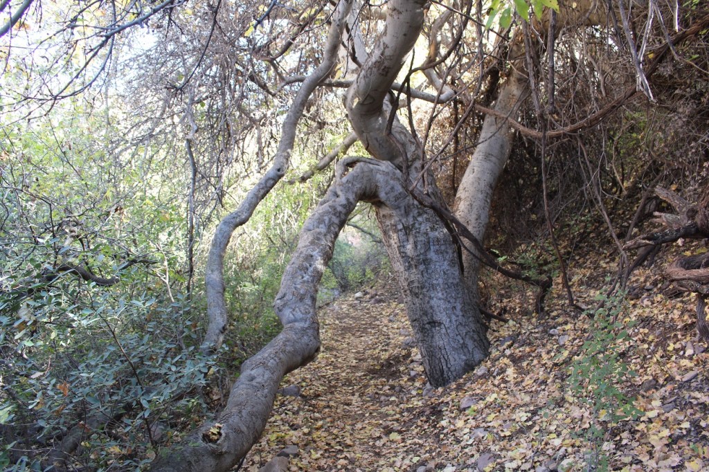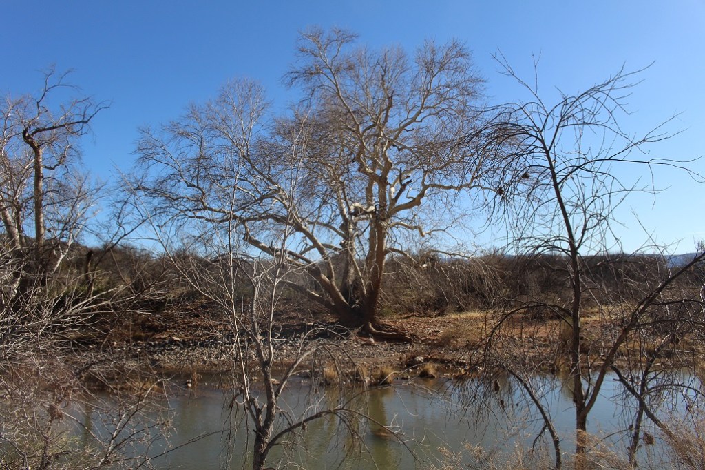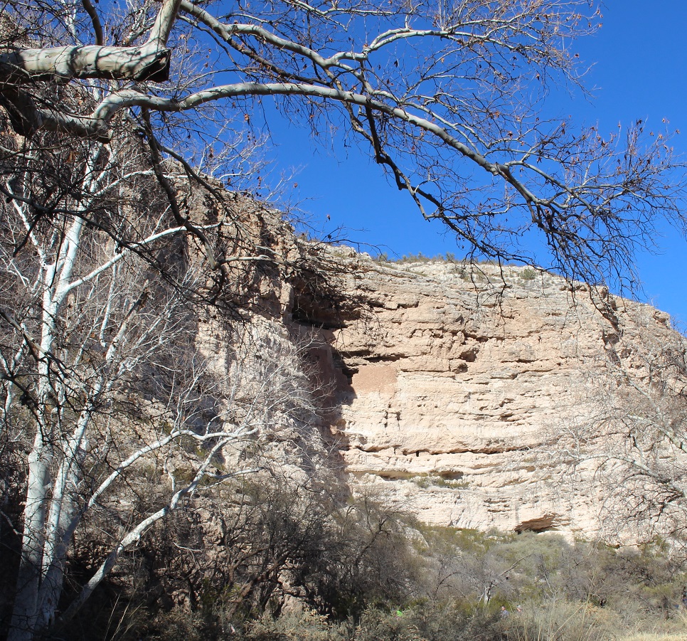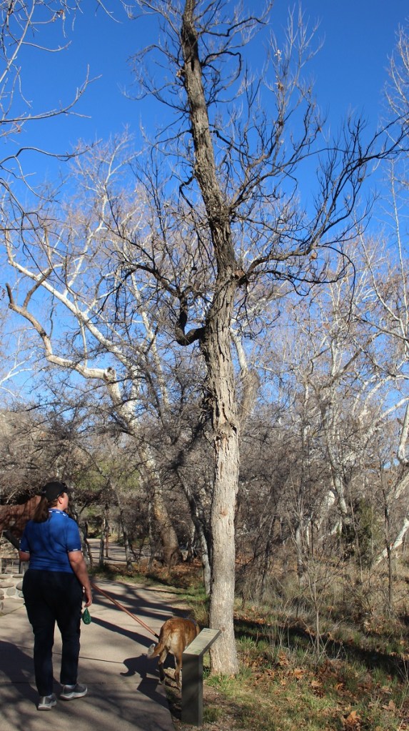Oneseed juniper (Juniperus monosperma — hey: I can figure out that Latin!) provided the Sinagua with wood for cooking, heat, and light, as well as shelter. The branches are also boiled for treating stomach disorders. When we’re hiking, Nancy and I really enjoy finding juniper berries — they smell really, really good. I love the character of this juniper’s trunk.This is Beaver Creek, which flows a few hundred feet south of the main cliff dwellings at Montezuma Castle. Residents of the cliff dwellings dug ditches to transport water for irrigating corn, beans, squash, and cotton crops that were planted on land by the creek. The large tree on the far bank of Beaver Creek is an Arizona sycamore.Providing food and shade, the Arizona walnut tree (Juglans major) was named ch’il nehe (“nuts you pound”) by the Apache. The thick husks of the walnuts were also ground to produce cloth, hair dye, and paint.Here we see a monument visitor and her dog (it is Nancy with Gunther) passing underneath the branches of a western soapberry (Sapindus saponaria) tree. The tree produces small yellow berries, but the fruit is harmful when eaten. Despite their toxicity (and true to the tree’s name), the berries are used to make soap for laundry, shampoo, and general bathing. You can also see an interpretive sign next to the tree; that signage adjacent to the plants and trees is where I got most of the background information for this posting.This is a view of Beaver Creek looking to the southwest. A few dwellings, much smaller than the main one we first encountered, were built in the cliffs on the right side of the photo. The creek was prone to flooding in spring, which was one reason the dwellings were built high on the cliffs.Here’s a plant that should be familiar to many: the prickly pear cactus, in particular the Engelmann’s variety (Opuntia phaeacantha). This most common of Arizona’s prickly pears is still widely eaten throughout the southwest (after removing the spines). The pads, called nopalitos in Spanish, can be steamed, fried, pickled, or roasted. The fruits after flowering, too, are edible and are used to make jelly as well as to create red dye. This specimen was just outside the visitor center at Montezuma Castle National Monument.Un cactus más para ti: the desert Christmas cactus (Cylindropuntia leptocaulis). In December of each year, this cactus produces a bright-red fruit which is crushed and made into jam. We saw some of these plants at Saguaro National Park near Tucson and would see additional specimens of desert Christmas cactus in a few days, at Tuzigoot National Monument.