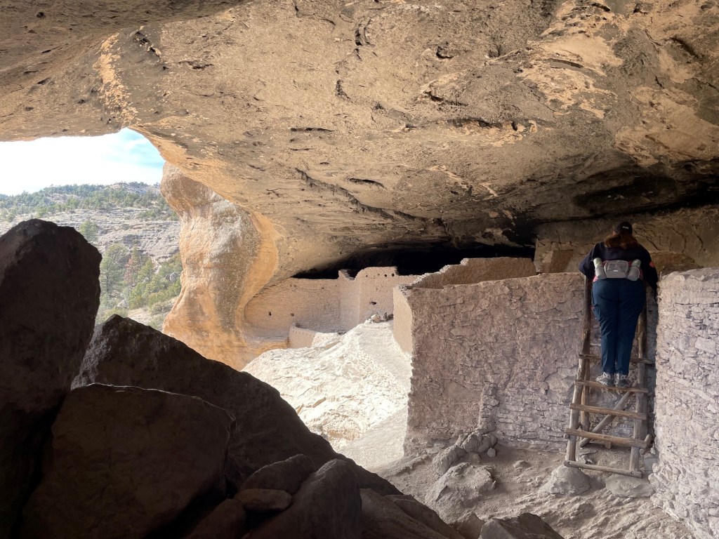 About 40 structures, ranging from large communal rooms to small storage areas, were built in five natural caves within the cliff. The dwellings provided homes for 12-15 families.Lena, the NPS volunteer, said that about 90 percent of the present-day dwellings is original; the rest has been work done by NPS to help protect and fortify the structures. It’s notable that walking around the structures within Gila Cliff Dwellings National Monument is permitted and encouraged; that’s not the case with all NPS cliff dwelling sites because of (wholly understandable) concern about destruction from human traffic. Nancy and I have really enjoyed visiting some of the more remote NPS locations in New Mexico and Arizona, in part because of the lack of crowds.This wood beam, or viga, is original to the cliff dwellings, and along with a series of other vigas and additional materials supported another floor above this room. The tree that the wood log came from was felled 500 years before the signing of the Declaration of Independence. I didn’t place anything next to it for a sense of scale (it’s 750 years old), but I’d say about 18 inches of the viga is protruding from the wall.Here is an intrepid researcher, from her tenuous perch high atop a wooden ladder, peering into the depths of one of the structures. What clues will she find as to what really happened? This is a view looking through the natural cave opening to the canyon wall on the other side of Cliff Dweller Creek below. The holes in the walls of the structure are where vigas were placed to provide support to another floor of the still-existing room.