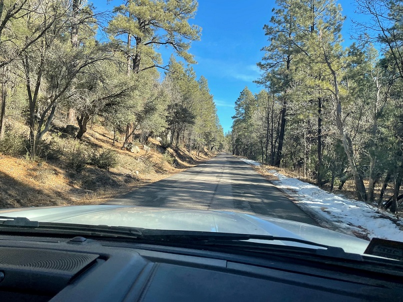Nancy and I visited Gila Cliff Dwellings National Monument on a Sunday in mid-January. Because dogs aren’t allowed on the trail to access the dwellings, we decided to board Gunther that weekend. This national monument is very isolated: despite being only about 45 road miles from Silver City, New Mexico, the drive takes about an hour and 45 minutes because of a large number of extremely tight turns.