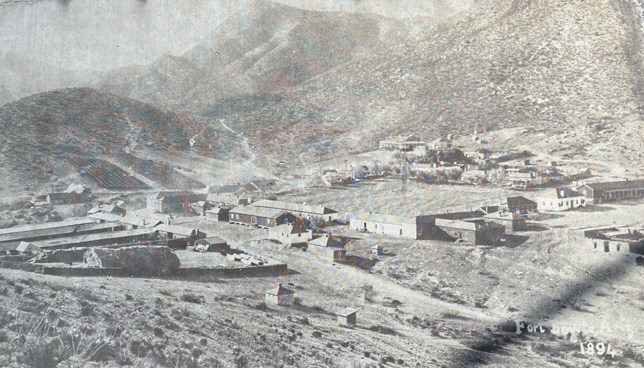 A 500-yard spur from the main hiking trail leads to these ruins of the first Fort Bowie. Construction started in July 1862 following the Battle of Apache Pass and the U.S. Army’s control of Apache Spring. A 100-man detachment of the 5th California Volunteer Infantry, under the command of Col. George Washington Bowie, completed the fort in two weeks. Incidentally, this instance of “Bowie” is pronounced “BOO-ee,” not “BOH-ee.” Also, that tree growing in the middle of the ruins is a catclaw acacia (Acacia greggii). Its Apache name is “ch’il gohigise,” which means “a bush that scratches you.” It has very sharp and claw-like thorns, but its seed pods were a significant food source for the Apache and they used the wood to make furniture and drumsticks. Bees are attracted to the catclaw’s blossoms and make a very distinctive honey.Although the Apaches didn’t control the water at Apache Spring any longer, they continued to attack travelers that weren’t being protected by the U.S. Army as they traversed Apache Pass. This first fort was only in use for six years as the California Volunteers pursued the Apaches with little success. It was apparently not an enviable duty post because of the extraordinary isolation, constant illness, poor living conditions, and consistent threat of Native American attack. I’d think, however, that the original builders would be pleased to know that the walls they constructed are still standing, in the heat of the Arizona sun, 160 years later. Regular U.S. Army soldiers relieved the volunteers in 1866 and began construction of the new Fort Bowie, 300 yards northeast of this location.This picture was taken looking to the southwest of the hill on which the first Fort Bowie was built; I’ve indicated the locations of several stops on the trail. The location of Apache Spring is not in this photo; it’s to the right of the area shown in the picture. The prominent mountain in the background is Government Peak, elevation 7,556 feet.As we approached the visitor center, we encountered a herd of 10-12 mule deer about 100 yards away. They gradually made their way up the opposite hillside, blending really effectively into the rocks and brush of the area.This is the visitor center for the Fort Bowie National Historic Site. At the end of the 1.5-mile hike, it’s an impressive structure that overlooks the site of the second Fort Bowie, and has a wonderful wraparound patio with plenty of rocking chairs and benches from which to admire the view. The building contains artifacts from the fort and other items representative of military life in the late 19th century; we didn’t spend much time in the building because due to Covid concerns NPS was understandably limiting how many people could be inside at the same time. That’s what is left of the fort’s armory on the left side of the image, well removed from the original site of the fort itself.Like the Indian agency from down the trail, there’s not much remaining of Fort Bowie. The mounds you see in the middle foreground are walls of the fort’s buildings that have been covered in plaster by NPS conservators in an attempt to preserve as much of the original construction as possible. This picture is taken from in front of the visitor center, looking to the northeast.This is a picture of a picture of Fort Bowie from January 1894, at the height of its presence at Apache Pass. For a perspective, the angular hill at the top left of the previous photo is the same one at the top center of this one. The tall building on the right side of the photo comprise the commanding officer’s quarters and in front of that structure are the officers’ quarters. The hospital is to the left and up the hillside a bit from the CO’s quarters. The low buildings at left are the corrals and stables; behind those are the ice machine and steam engine. In total, there are about 38 buildings in this photo. With the Apache Wars ending after Geronimo’s final surrender in 1886, the Army occupied Fort Bowie for eight more years. The U.S. Army abandoned Fort Bowie nine months after this original photo was taken. Area residents stripped the wood from the buildings for their own uses, and all that was left were adobe walls.Here’s a view over the ruins looking southeast from the visitor center’s railed porch, where Nancy and I sat on rocking chairs while enjoying a picnic lunch. Gunther collapsed in the shade of the porch. Some of the fort’s ruins can be seen in the mid-foreground as light tan mounds. You may have noticed the prominent rock formation in the background in previous photos; it is called Helen’s Dome, elevation 6,376 feet. The granite peak is reportedly named after the wife of an officer at Fort Bowie, and served as an important landmark for travelers approaching Apache Pass.