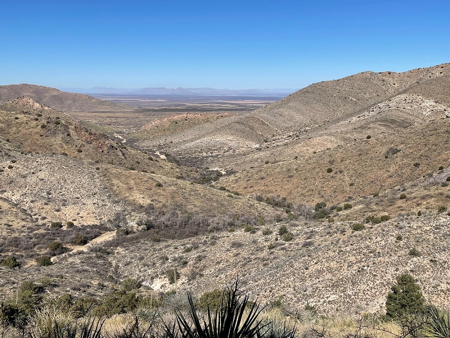 This spectacular view shows the valley of the eastern approach to Apache Pass and the Peloncillo (Spanish for “little baldy”) Range, 35 miles away on the horizon, and just beyond those mountains lies the New Mexico/Arizona border.