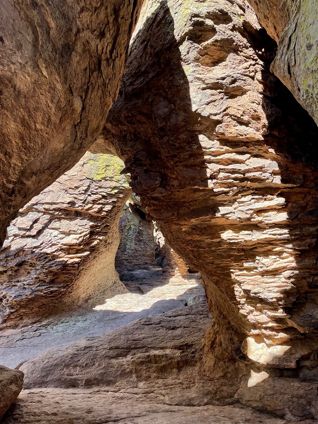 Let’s get back to rocks: the pinnacles in Chiricahua National Monument are formed by erosion. Cooling and uplift of the rocks formed cracks and joints in the tuff. Over millennia of weathering from ice wedging and water erosion, the cracks widened and weaker materials washed away to leave spires of rock. Here’s an interactive exercise: hold up your hand in front of you with your fingers straight and close together (go on: it’s fun!) Imagine that your closed fingers are a wall of volcanic rock, with your fingers separated by joints in the rock. Now slowly separate your fingers, as millions of years pass and countless freeze and thawing cycles of ice, as well as other erosional actions, wear down the rocks between your digits. Congratulations: you’ve created rock spires – told you it was fun.