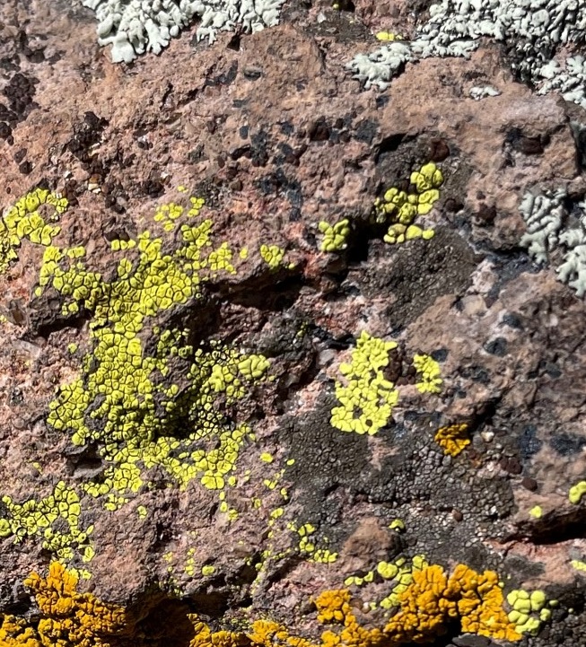When the flows of hot ash settled to the earth, the heat they contained, combined with the immense pressure of layer after layer of ash, welded the material into solid rock. That welding action wasn’t always enough to transform the ash into solids; some layers cooled too quickly to weld together, and remained softer than other areas. There’s a hiker (in purple on the left) behind this column to give a sense of scale; also note the evergreen shrub growing out of the top of this column. Many years ago, the seed of that shrub was dropped into a crevice in the top of the rock (perhaps by a bird or a breeze); the seed germinated and the roots of that growing shrub are now helping to expand the crevice even further. We saw many cases of that happening: grasses, shrubs, cacti, and trees, growing in loose material in rocks and those plants’ roots helping to slowly but surely break those rocks apart, especially as rainfall and snowmelt freezes and expands in the crevices.Those layers in the rocks are seen in this photo. Also note the green material that’s on the rocks (and seemingly every other rock in the monument).Here’s a closeup of that green material: lichen, along with several other different-colored varieties. Lichen, too, is an erosive factor for rocks. Lichen is a plant-like composite organism (but not a plant) that attaches to rocks and organic materials like tree trunks. In their very slow growth cycle, they release weak acids that contribute, day by day over the centuries, to the breakdown of rocks.There are about 20,000 species of lichen in the world, and there are at least four of them in this picture. I have a hard enough time remembering how to tell sparrows apart and I’m not about to try learn how to identify lichen (but I like ’em)!