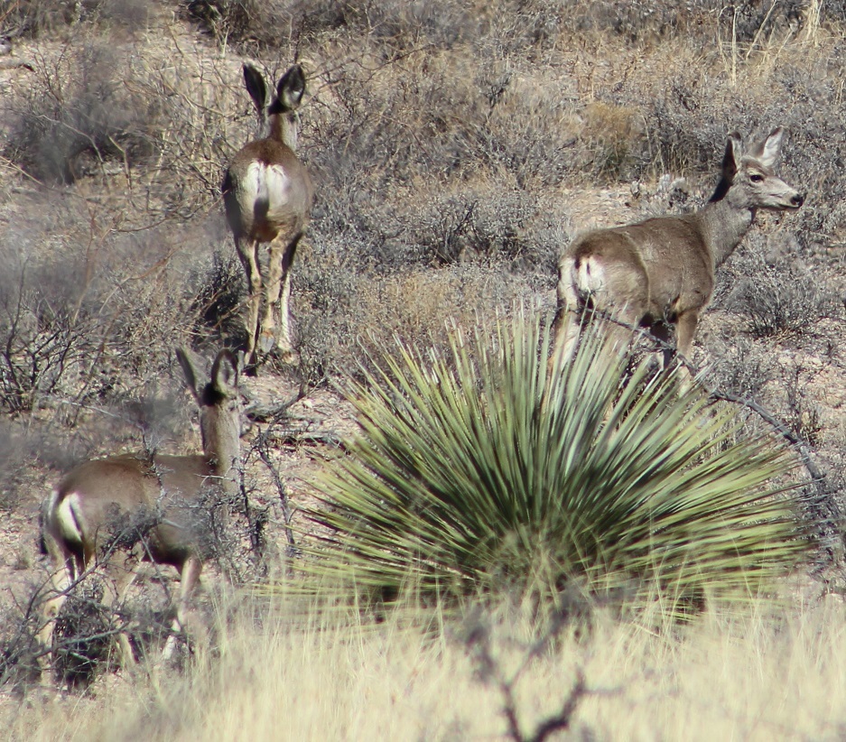 The eastern side of the Great Sand Dunes from the national park’s visitor center, about half a mile away. Mt. Herard (13,345 feet) is in the background. It’s estimated that the dunes contain 1.2 cubic miles of sand (imagine a cube with edges 1.2 miles long and then fill it with sand).We were both surprised at how many visitors the dunes received that day, given the time of year. Many were apparently from other countries, which is fairly common to experience during the off-season. The park attracts about half a million people each year.Gunther had a great time running and jumping around in the sand. We enjoyed ourselves as well, although we neither ran nor jumped.While we enjoyed a picnic lunch in the parking lot of the dunes, a small herd of mule deer paraded by. There were two bucks and probably eight or 10 does like this one.