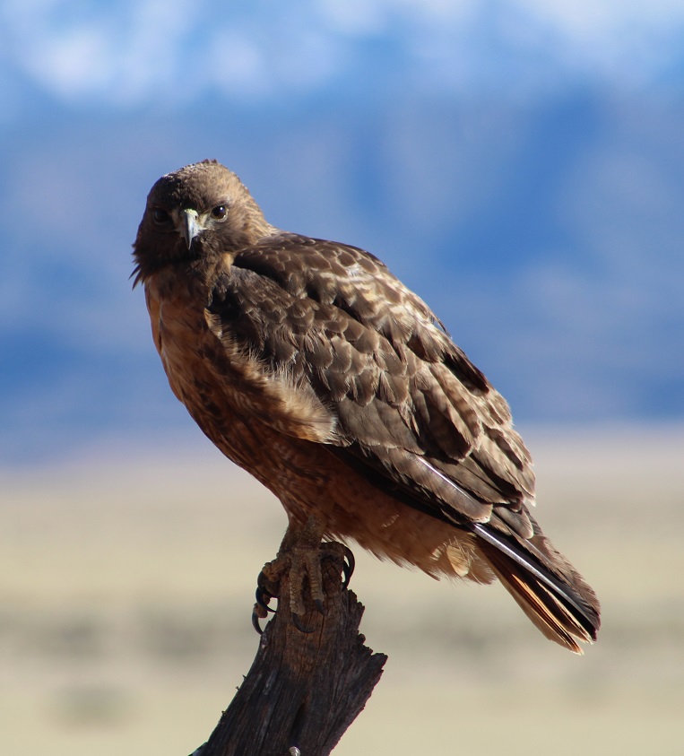 This is the rock formation that gives the Dos Cabezas (“two heads” in Spanish) Mountains their name. It doesn’t take much imagination to see faces in the rocks, especially the one on the left. This formation is about 15 miles due west of Willcox; it’s easily visible from the town (I enjoyed watching the colors of the setting sun on the formation while playing with Gunther in the campground’s dog run), but this perspective from the opposite side definitely shows you why it’s named what it is.We also passed this red-tailed hawk, perched on a roadside fencepost, on the way back to Willcox. It let me take five or six pictures before taking off. That’s snow-covered Mount Graham in the background, but from the opposite side of where we saw it while staying in Safford, Arizona.