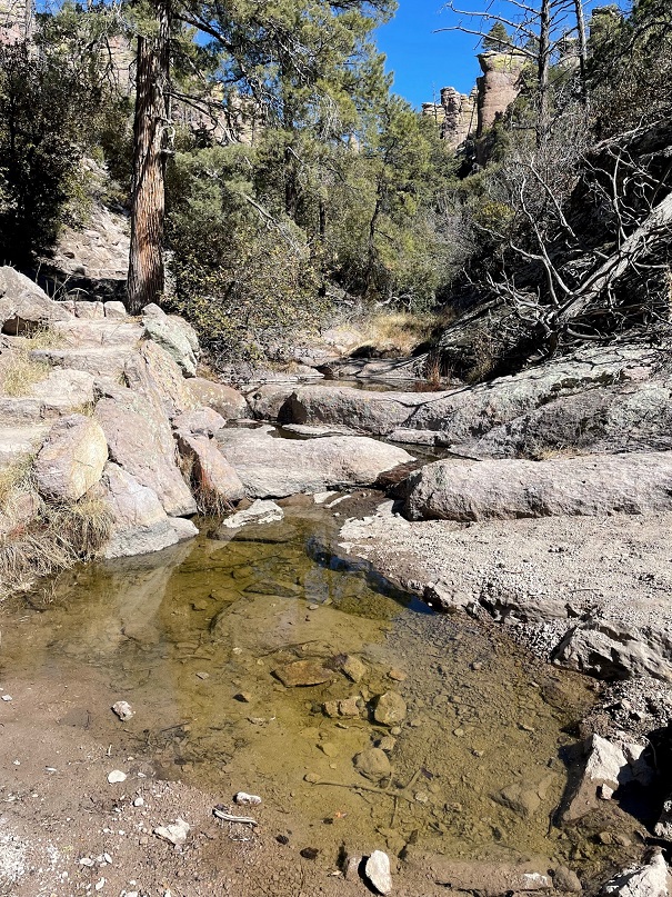 Here are two species of oak trees growing just a couple of feet apart from each other along the Echo Canyon Trail. The one on the left is netleaf oak (Quercus rugosa) and on the right is silverleaf oak (Quercus hypoleucoides). With enough water, silverleaf can grow up to 60 feet tall. That’s not happening in this desert canyon; both of these were two-feet-high shrubs.This is narrowleaf four-o’clock, a wild close relative of the four-o’clock annual plant that’s popular in gardens. Four-o’clocks have been cultivated since the time of the Aztecs. I think we were a bit too early to see it in bloom.Here, though, is a plant in bloom. This purple prairie verbena was attracting a large black butterfly that wouldn’t stay still for a picture.This is a very common type of cactus called strawberry hedgehog, growing in a rhyolite crevice along the trail. It has pretty fearsome spines.This was an extraordinarily rewarding hike. We seemed to stop every few paces just to enjoy the formations and views.We were a little surprised to see this good-sized spring at about the halfway point of our loop hike. It provided a little rivulet of running water further downstream.Just another example of nature being absolutely wild sometimes. This is a formation of rocks alongside part of the hike called Hailstone Trail. I’d love to find out how these rocks were formed, as well as some of the other atypical formations earlier in the hike. We had a blast at Chiricahua National Monument and will definitely return to get those answers.