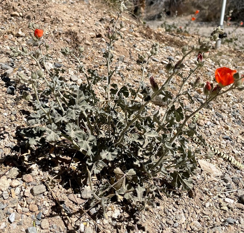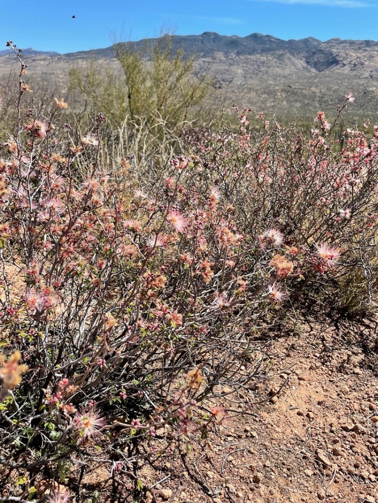 The Apache name for catclaw acacia, ch’ill gohigise, means “a bush that scratches you.” The long and sharp thorns of catclaw acacia (Acacia greggii) are best avoided, but ancient peoples relies on many different parts of the bush for food and the branches are used to make furniture and drumsticks. The honey made from this tree’s blossoms is especially prized for its delicate nature. This specimen is growing directly in front of the dwellings; there’s an doorway visible behind the bush (and accessible only by ladder). We first saw catclaw acacia in late February 2022, when we visited Fort Bowie National Historic Site in southeast Arizona.