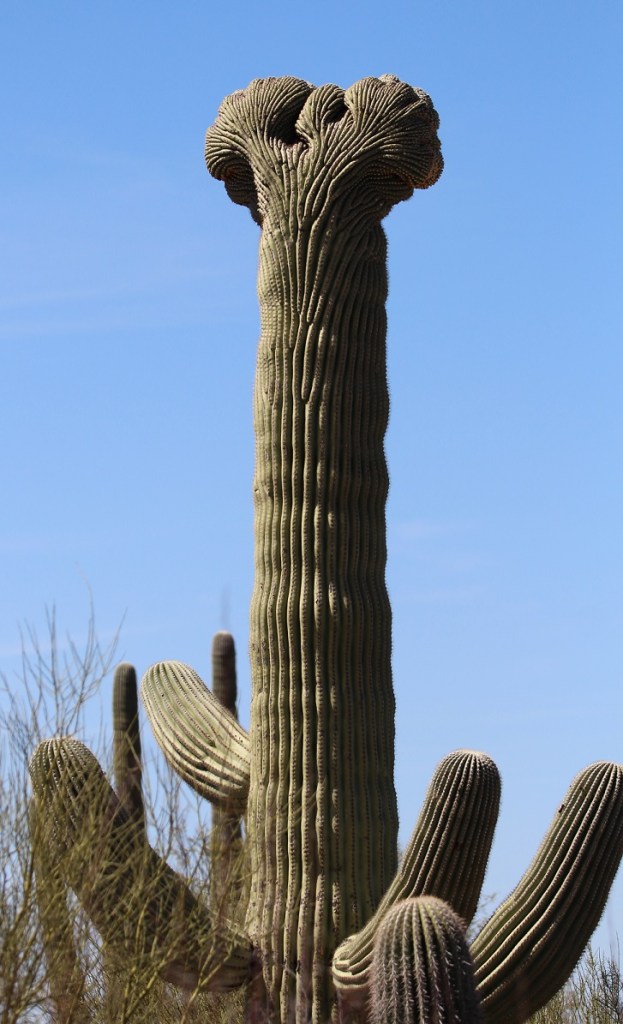 I learned a valuable bird photography lesson while taking this photo. From an eighth-mile away, the object on the right top of this saguaro appeared to look through my telephoto lens to be another bud of cactus growth. However, I took a picture anyway in case it was a bird of some kind. The picture didn’t turn out very well because it was from 700 feet away. From about 150 yards, it still appeared to be a cactus bud, but I took another photo anyway (this one) so that I’d have a better picture of a possible bird. From about 50 yards, it was clear without looking through my telephoto lens that it was only a cactus growth so I didn’t take any more pictures of it (I already had plenty of pictures of cactus from 150 feet away). Then, at about 40 yards, the cactus growth lifted its wings and flew off to the west. It was, in fact, an American kestrel, North America’s smallest raptor and a bird that I have really, really wanted to get a good picture of for several years. This terrible photo will have to do for now.Here we see an intrepid hiker making her way past some saguaros on the Loma Verde Trail. Who knows what she’ll see around the bend of the trail? (It’ll be more saguaros.) Note the large number of bird-nest cavities in the cactus nearest the trail – it’s like a condominium building.This cactus is at least 50 feet tall and looks like it has some stories to tell. Maybe while giving you a big hug …… but you probably wouldn’t want it to. This is a closeup of the top of a three-foot-tall saguaro growing next to the trail. It’s definitely a cactus.This photo gives an idea of the number of saguaros in the park – they’re in good shape for now, but it’s only because of the establishment of the national park that we get to see them in this quantity.