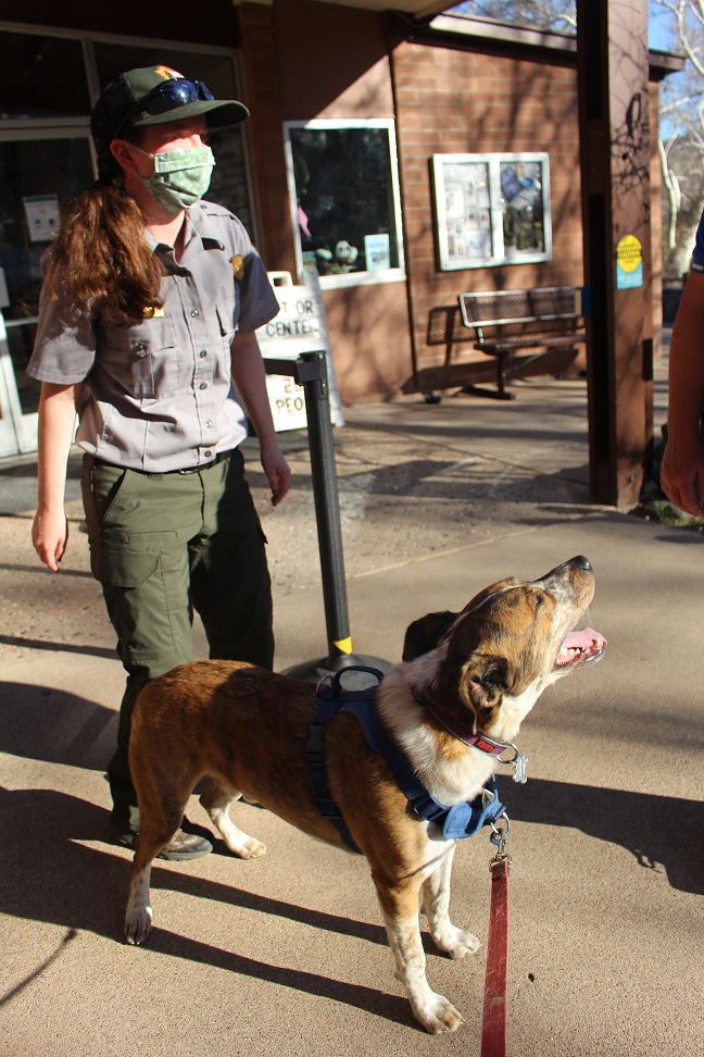 Park Ranger Stephanie greets the newest B.A.R.K. Ranger, Gunther, at the Montezuma Castle National Monument Visitor Center and congratulates him on his many achievements. Here’s Gunther relaxing in the Goddard with his certification (the inside is signed by Ranger Stephanie). Good job, Gunther!