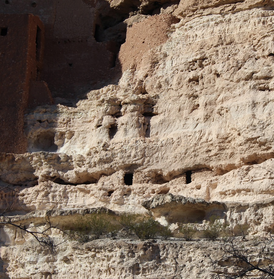 The cliff dwellings are built in Verde Formation limestone, a relatively soft sedimentary rock. Over millions of years, the erosional forces of water and wind have had their way with the limestone to carve many holes into the rock. The erosional holes that are enlarged by humans into structures are called cavates by archeologists. At Montezuma Castle, most cavates extend about 10 feet into the cliff. By closing up naturally open spaces, and building exterior and interior walls with masonry, the Sinagua were able to construct secure housing for their culture.